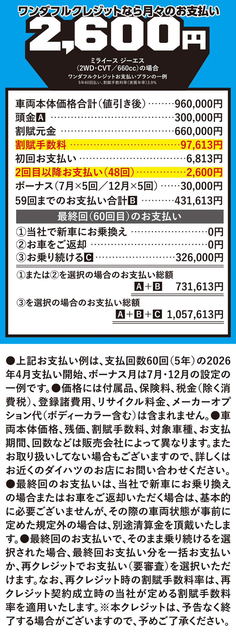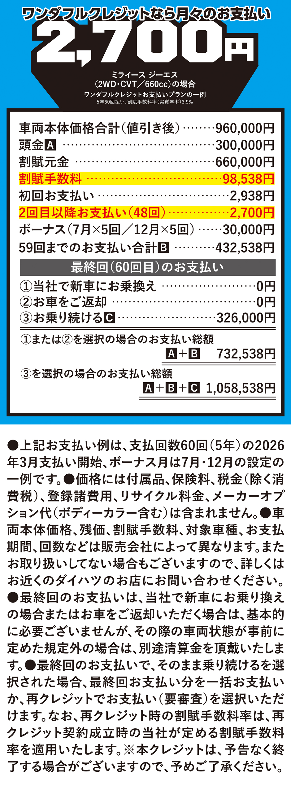 ダイハツの残価設定型クレジット「ワンダフルクレジット」を使えば、月々の支払いがとてもラクラク。