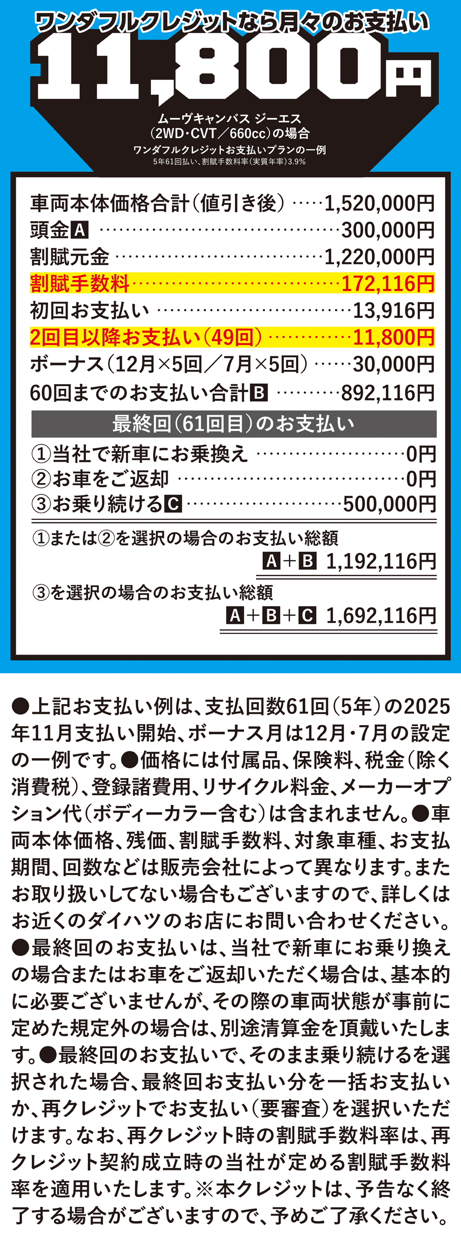 ダイハツの残価設定型クレジット「ワンダフルクレジット」を使えば、月々の支払いがとてもラクラク。