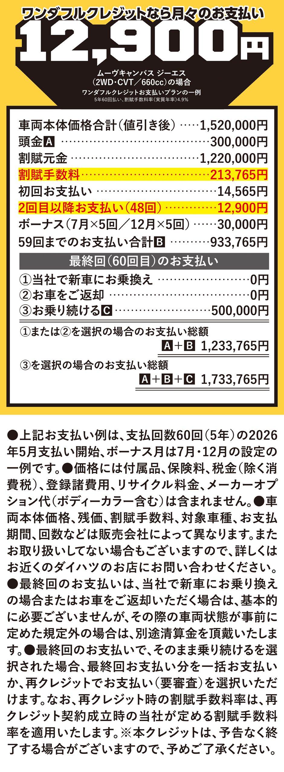 ダイハツの残価設定型クレジット「ワンダフルクレジット」を使えば、月々の支払いがとてもラクラク。